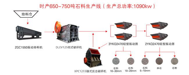 以常見的時產700左右顎式破碎機石料生產線配置舉例,工藝流程如上圖所示,大塊物料經料倉連續、均勻的輸送到DLEV125顎式破碎機中進行初級破碎,破碎后的一部分物料直接進入篩分環節,一部分物料輸送到XPC1213錘式反擊破碎機中細碎整形,而后進入篩分環節,篩分出來不符合成品料粒度要求的被返料帶返回二級破碎機再次加工,形成一個閉路循環,設備配置可以根據項目實際需求靈活配置。