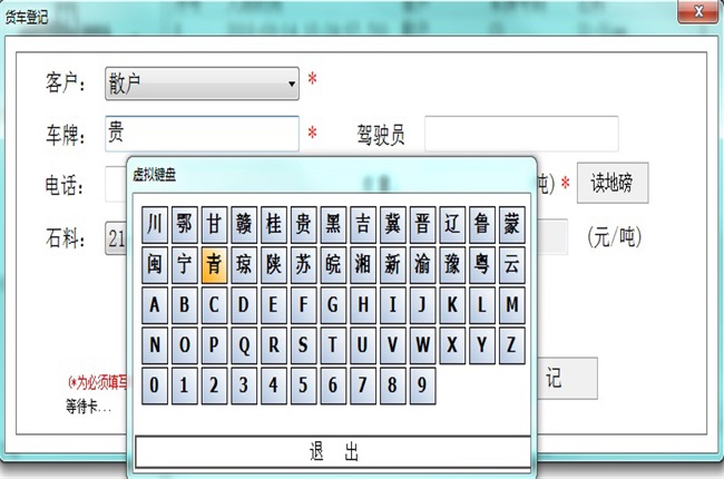 如上圖,當打開貨車登記的界面打開后,只需要在“車牌”的輸入框里點擊鼠標,就會彈出一個包含省份簡稱、字母和數字的虛擬鍵盤,操作員只需要用鼠標點擊需要的虛擬按鍵就可以了,免去了打字的煩惱,解決了用戶的電腦使用水平不高、打字慢的問題。
