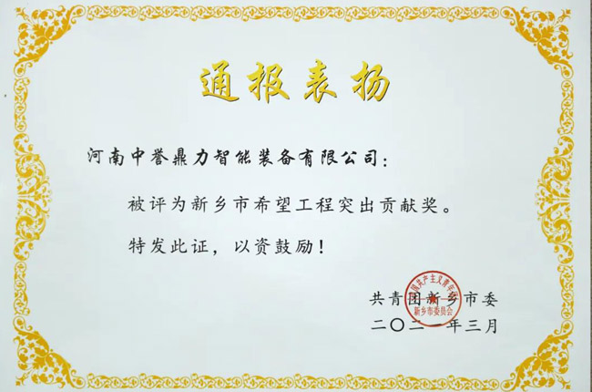 會議宣讀了《共青團新鄉(xiāng)市委關(guān)于表揚2020年度集體和個人的通報》,對新鄉(xiāng)市過去一年在疫情防控、復(fù)工復(fù)產(chǎn)、脫貧攻堅和鄉(xiāng)村振興等工作中取得成績的集體和個人進行表彰——河南中譽鼎力智能裝備有限公司團總支被授予“新鄉(xiāng)市五四紅旗團(總)支部”;河南中譽鼎力智能裝備有限公司被授予“新鄉(xiāng)市希望工程突出貢獻獎”!