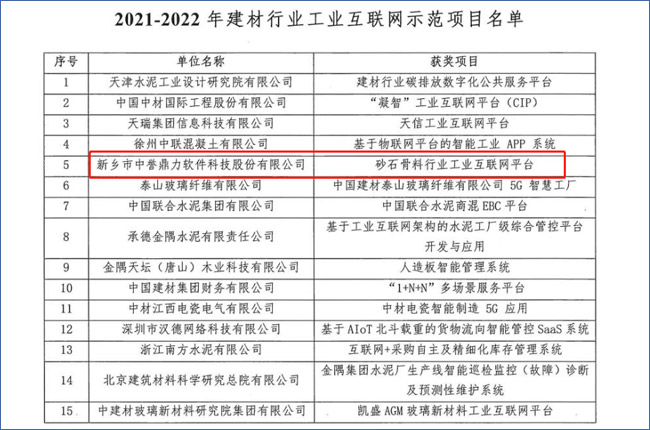 新鄉市中譽鼎力軟件科技股份有限公司“砂石骨料行業工業互聯網平臺”項目被評為“2021-2022年建材行業工業互聯網項目”。