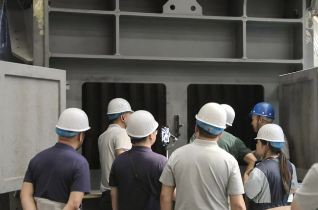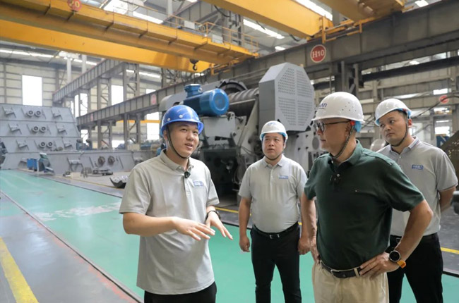 中譽鼎力集團副董事長馬鈺博、技術總監劉海淘在智能化車間為砂石骨料網考察團成員一一介紹了集團主營產品及其制造工藝,并對硬巖設備代表產品臥式旋回破碎機進行了詳細的講解。