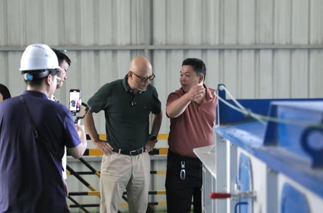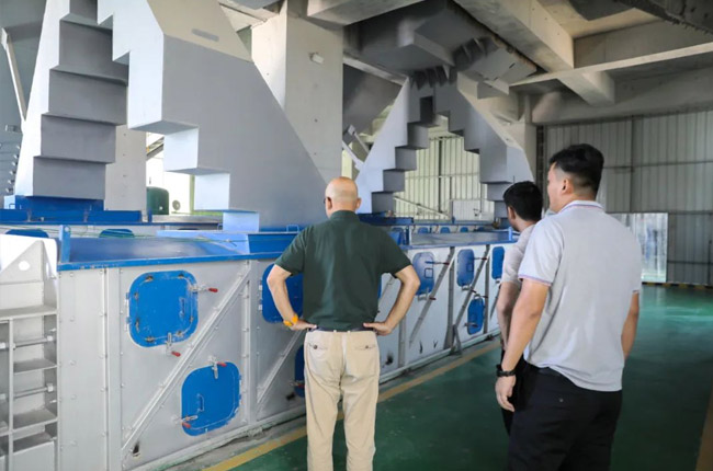 在項目輸送車間,考察團成員著重了解了中譽鼎力創新產品箱式皮帶輸送機及其優勢,點贊該設備環保、省錢省力。