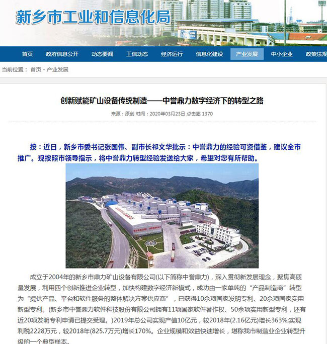 3月19日,新鄉市工信局發布了一篇題為《創新賦能礦山設備傳統制造——中譽鼎力數字經濟下的轉型之路》的文章。新鄉市委書記張偉、副市長祁文華批示:中譽鼎力的經驗可資借鑒,建議市推廣,并詳細介紹了中譽鼎力的轉型經驗。