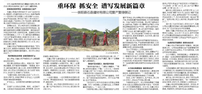 4月底,湖北日報刊文《重環保 抓安 譜寫發展新篇章——崇陽縣石鑫建材有限公司復產復綠側記》和湖北電視臺報道《復工復產復綠做表率 崇陽縣石鑫建材再起航》,對中譽鼎力承建咸陽市石鑫建材環保智能砂石骨料生產線復工、復產、復綠情況進行了方位宣傳。