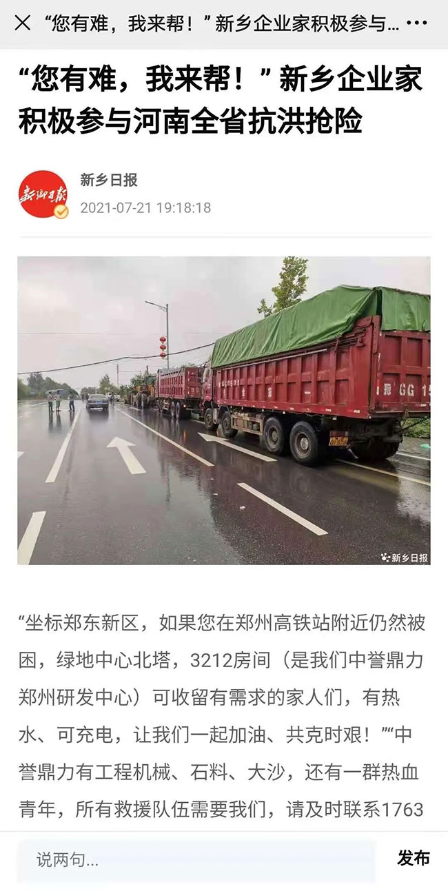 汛情就是命令。在張治民董事長的號召下,當晚,公司緊急安排4輛機械鏟車在衛輝市區各街道巡邏,為需要幫助的人義務提供及時的救援服務;面對省會鄭州的嚴重汛情,地處鄭東新區鄭州高鐵站附近綠地的【中譽鼎力鄭州研發】熱心助力,為需要收留的旅客和鄭州市民提供留宿休息場所和熱水、充電等服務;中譽鼎力員工也積參與行動,自駕越野車幫助有需要的人順利回家……