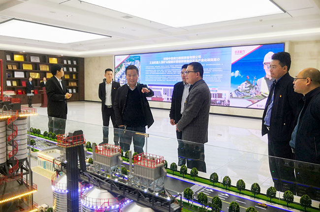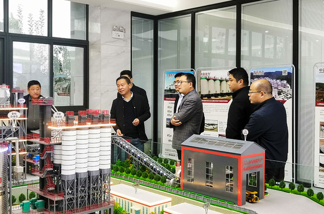 在中譽鼎力智能裝備有限公司綜合辦公樓,調研組導先參觀了中譽鼎力多位一體循環建材產業園項目沙盤,并觀看了公司相關宣傳片,對中譽鼎力主營業務及近年來發展情況有了進一步了解。