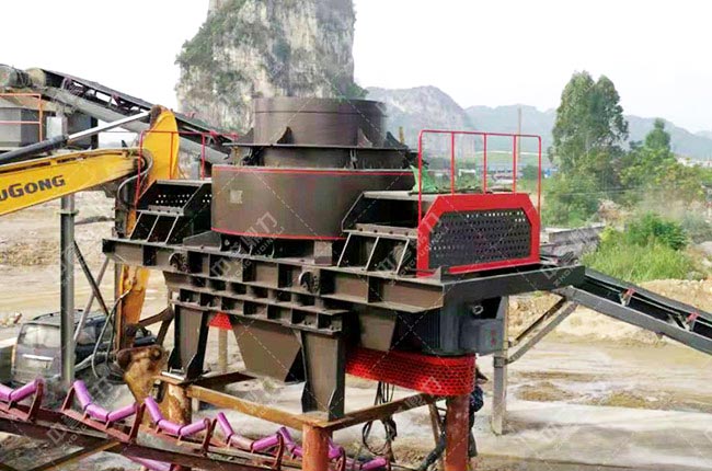 石料由機器上部直接落入高速旋轉的轉盤,在高速離心力的作用下,與另一部分以傘型方式分流在轉盤四周的靶石產生高速度的撞擊與高密度的粉碎,石料在互相打擊后,又會在轉盤和機殼之間形成渦流運動而造成多次的互相打擊、磨擦、粉碎,從下部直通排出。形成閉路多次特環,由篩分設備控制達到所要求的粒度。