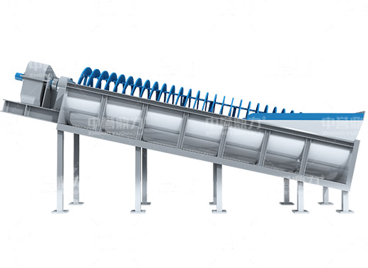 螺旋式洗砂機由傳動部分、螺旋、洗槽、清淤管、溢流管、尾軸、機殼等部分組成;傳動裝置:由電動機、皮帶輪、減速器等組成,用來驅動螺旋旋轉,轉速大小可調整;螺旋部分:空心軸、支架、螺旋葉片等組成,螺旋葉片由耐磨鑄鐵制成,更換方便;水洗槽:加厚鋼板焊接而成,底部配合螺旋片呈半圓形;