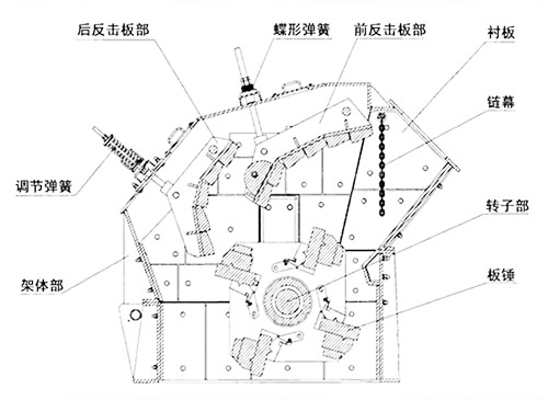 DLHCS反擊式破碎機主要運用沖擊能的破碎原理,轉子在電機帶動下高速旋轉,物料進入機腔后落入板錘工作區,板錘在轉子的帶動下飛速旋轉,撞擊物料破碎,而后物料又被拋向機腔內壁的反擊襯板,后被反彈到板錘,與此同時,物料在機腔內互相碰撞,經多次破碎后達到成品料要求的物料從出料口排出。