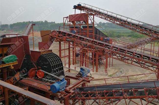 二、粗破后的物料由膠帶輸送機送入到二破(XPC1216錘式破碎機)進行細碎