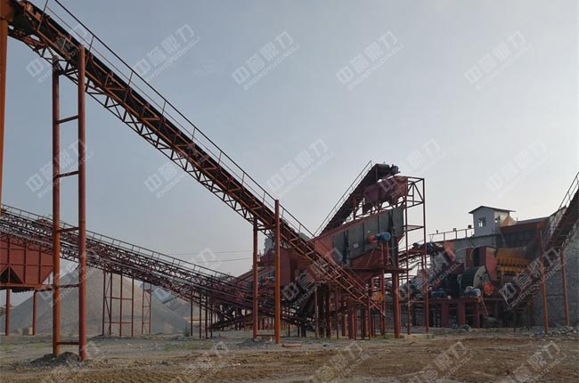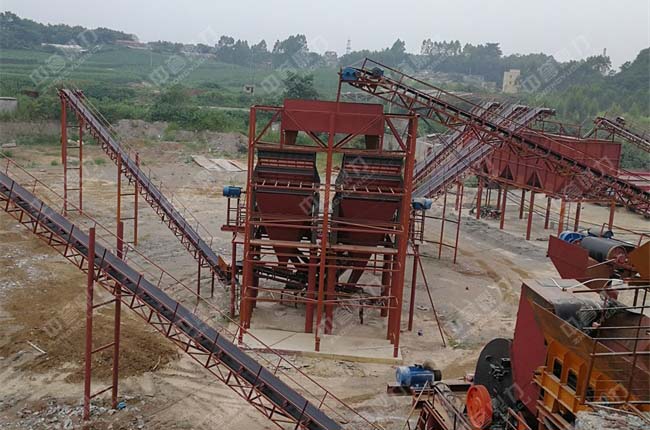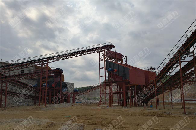 三、細碎后的物料被輸送到兩道并篩中進行篩分,篩分出五種不同規格的成品料,由輸送帶送到成品料堆。成品粒度可按用戶的需求進行組合和分級。