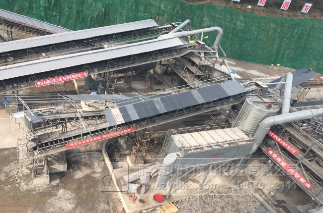 上圖為貴州遵義同興源建材時產1000噸骨料生產線生產現場,排列整齊的皮帶輸送帶有序的運送骨料,在一些皮帶輸送機密集的區域,設置了脈沖袋式除塵器,也是由中譽鼎力研發的,將設備安裝在基臺上方,占地面積小,節省基建投資。