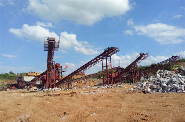 石料由ZGC1038振動給料機均勻地送到頭破(PCZ1510重型錘式反擊破碎機)進行粗破,粗破后的物料由膠帶輸送機送入到二破(XPC0808錘式破碎機)進行細碎,細碎后的物料被輸送到一組并篩2YKQ2060振動篩進行篩分,篩分出1-3、1-2、0-5和石粉四中成品料,由輸送帶送到成品料堆。成品粒度可按用戶的需求進行組合和分級。