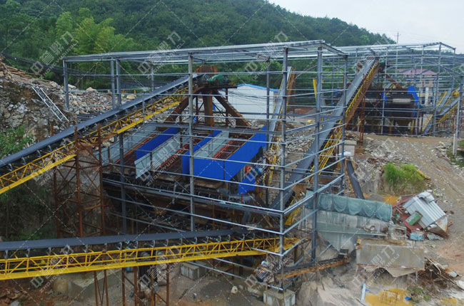 大塊石料經ZGC2050振動給料機均勻、連續的送到PCZ1620重錘破進行破碎,破碎后的物料被送到中轉料倉,再由兩臺ZGC2038給料機送到兩臺PC1220整形錘破進行整形加工,經過再次加工的物料被輸送到一組3臺3YKZ3070振動篩進行篩分,篩分出1-3以下的石料、土石粉和一部分回料,1-3以下的料被輸送到下一組3臺3YKZ3070振動篩進行再次篩分,回料被返料帶返回整形錘破進行再次破碎,形成一個閉路循環,終篩分出1-3/1-2/0-5和石粉四種成品料。